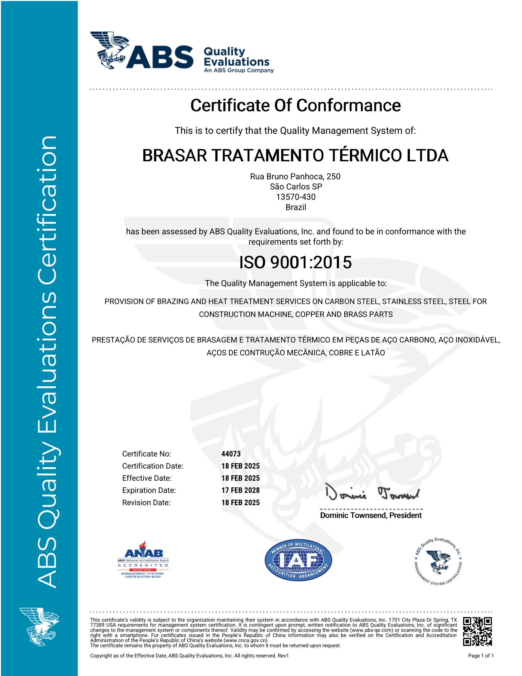 Nosso sistema de gestão da qualidade foi certificado em conformidade com a Norma ISO 9001:2015 através da ABS Quality Evaluations e Dun & Bradstreet.